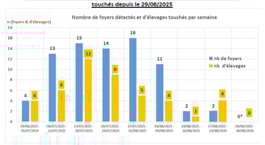 Ces foyers concernent 45 élevages (nb : un élevage (identifié par un EDE unique) peut être composé de plusieurs unités épidémiologiques (lots ou parcelles). Chaque unité épidémiologique peut être à l’origine d’un foyer distinct si aucun lien épidémiologique n’est établi entre les différentes unités).