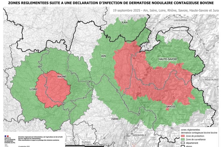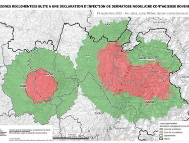 Un deuxième foyer a été détecté dans l’AIN (5 bovins). Il a été depeuplé dans la foulée. La ZS s'agrandit de 33 communes dont des dommunes dans le Jura. Le précédent foyer avait été détecté le 23 août, soit après une période continue de deux semaines sans aucun nouveau foyer en France.