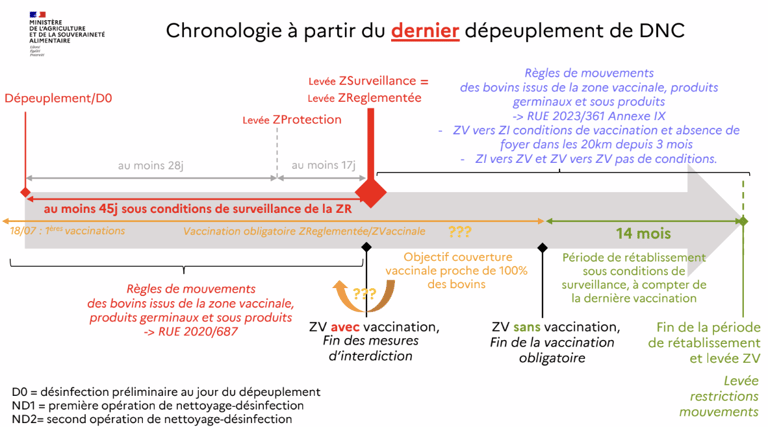 Les échanges intra-communautaires peuvent se poursuivre entre les zones non réglementées. Aucun transfert (entrée ou sortie) ne sont permis entre les zones réglementées DNC (la zone réglementée est levée 45 jours après la désinsectisation du dernier foyer ou la fin de la vaccination). Concernant les exportations depuis la ZR vers les pays tiers, elles sont interdites pendant 14 mois après le dernier cas ou la dernière vaccination) sauf accords bilatéraux. Le transport des animaux provenant de zones indemnes peut passer dans la zone réglementée sous la condition d’utiliser les grands axes.