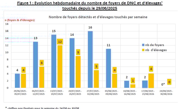 Au 24 septembre , 79 foyers de DNC (+1 foyer le 19/09/2025) ont été détectés en France, dans deux départements :